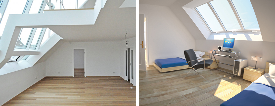 Das Herzstück bildet die über 2 Geschoße reichende Gaupe aus Glas. Sie lässt Licht, Luft, Sonne und Wohlbefinden in die Wohnung einströmen. Die Garage im Haus erreichen Sie über die Rembrandtstraße. Über das Rolltor mit Fernbedienung erreichen Sie den neuen Personenlift im EG. Dieser bringt Sie auf beide Wohnebenen: Entweder ins 1. Dachgeschoß in den Vorraum oder ins 2. Dachgeschoß direkt in den Ess-/Küchenbereich. (So kommen Ihre Lebensmitteleinkäufe mühelos vom Auto in die Küche.)