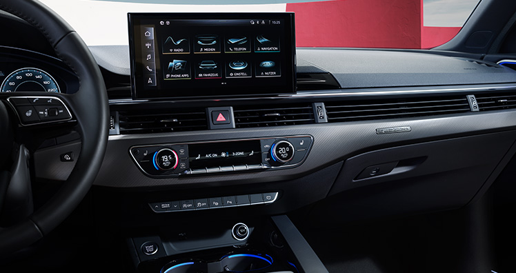 Mit seinem neuen MMI-System bietet der hochvernetzte Audi A4 ein Bedienerlebnis wie ein modernes Smartphone. Ein MMI touch-Display mit akustischer Rückmeldung übernimmt die Funktionen des bisherigen Dreh-/Drück-Stellers auf der Mitteltunnelkonsole. Das hochauflösende TFT-Display hat das Format 10,1 Zoll. Seine Grafik ist bewusst clean und reduziert gehalten, die Menüstruktur orientiert sich mit ihren straffen Hierarchien an den Erwartungen des Benutzers und zielt auf eine leichte Bedienung. Die MMI-Suche basiert auf freier Texteingabe und führt sehr schnell zu Treffern. Die natürlich-sprachliche Steuerung, eine weitere Funktion des neuen Systems, versteht viele Formulierungen aus dem alltäglichen Sprachgebrauch.