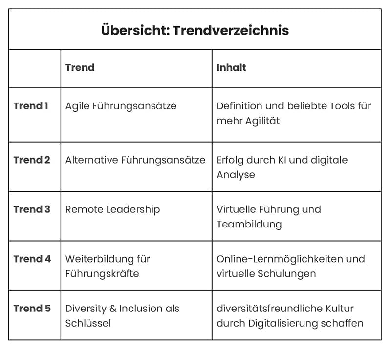 Für die erfolgreiche Implementierung dieser Punkte sollten Führungskräfte dazu in der Lage sein, technologische Prozesse zu verstehen und ihre Medienkompetenz zu entwickeln. Führungskräfte, die diese Trends erfolgreich umsetzen, können von besserer Anpassungsfähigkeit, höherer Innovationskraft und gesteigerter Teamleistung profitieren.