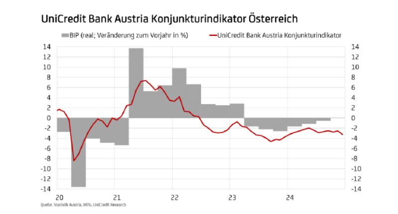 Die Konjunkturstimmung hierzulande hat sich zum Jahreswechsel deutlich eingetrübt. "Der UniCredit Bank Austria Konjunkturindikator ist im Dezember auf minus 3,3 Punkte gesunken. Damit fiel der Indikator zum Jahresabschluss auf den niedrigsten Wert des gesamten Jahres. Wenn auch die Verschlechterung der Stimmung die tatsächliche Lage negativ überzeichnet haben dürfte, ein klares Ende der Konjunkturschwäche scheint jedenfalls in weiter Ferne zu sein", sagt UniCredit Bank Austria Chefökonom Stefan Bruckbauer und ergänzt: "Der Durchschnittswert unseres Konjunkturindikators von minus 2,9 Punkten zeigt, dass sich das vierte Quartal 2024 in die Reihe der schwachen Quartalsergebnisse seit Mitte 2022 eingefügt hat. Der Dienstleistungssektor dürfte allerdings von einem stärkeren privaten Konsum profitiert und zumindest einen geringfügigen BIP-Anstieg ermöglicht haben. Insgesamt ist die österreichische Wirtschaftsleistung 2024 dennoch um zumindest 0,5 Prozent gesunken."