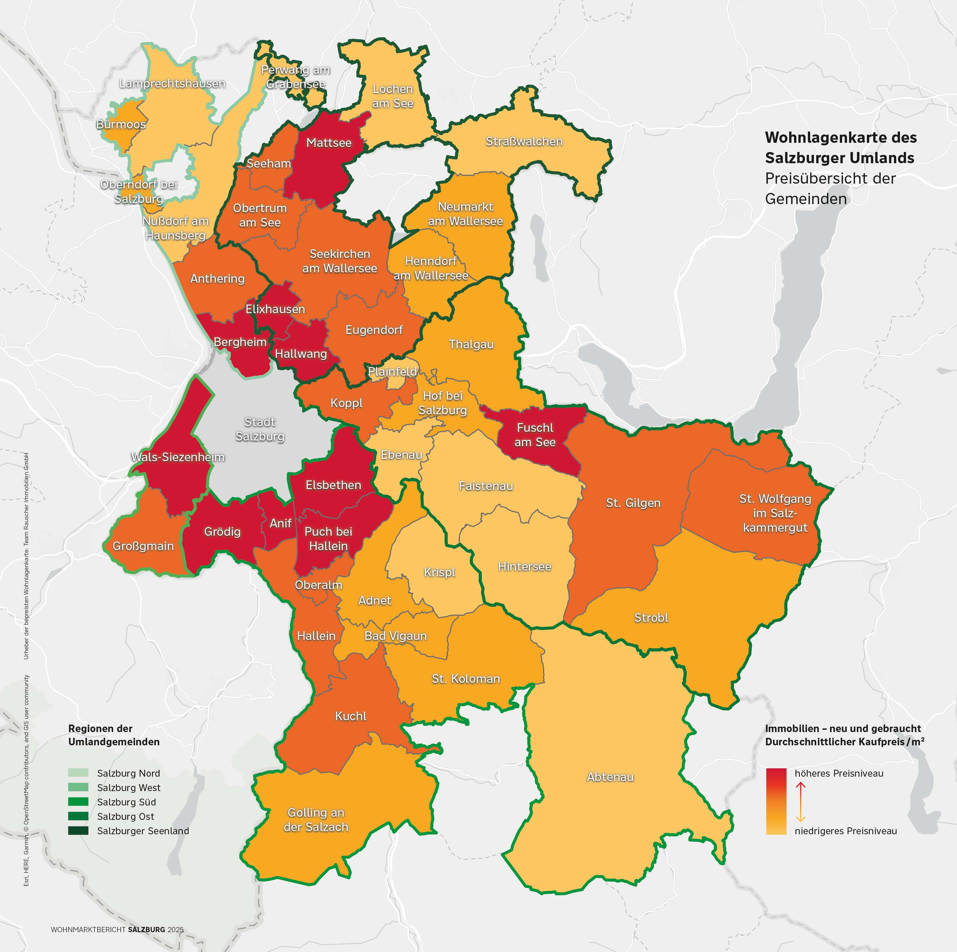 Rauscher: Die Käufer wählen das stadtnächste leistbare Umland. Grundsätzlich werden benachbarte Orte oder Gemeinden bevorzugt: Wer in Aigen wohnt, geht beispielsweise nach Süden, die Bewohner von Maxglan gehen eher nach Westen, in Liefering und Itzling ansässige zieht es nach Norden. Besonders anschaulich wird das in unserer Wohnlagenkarte (unterhalb). Hier sind die Gemeinden preislich abgestuft eingefärbt.