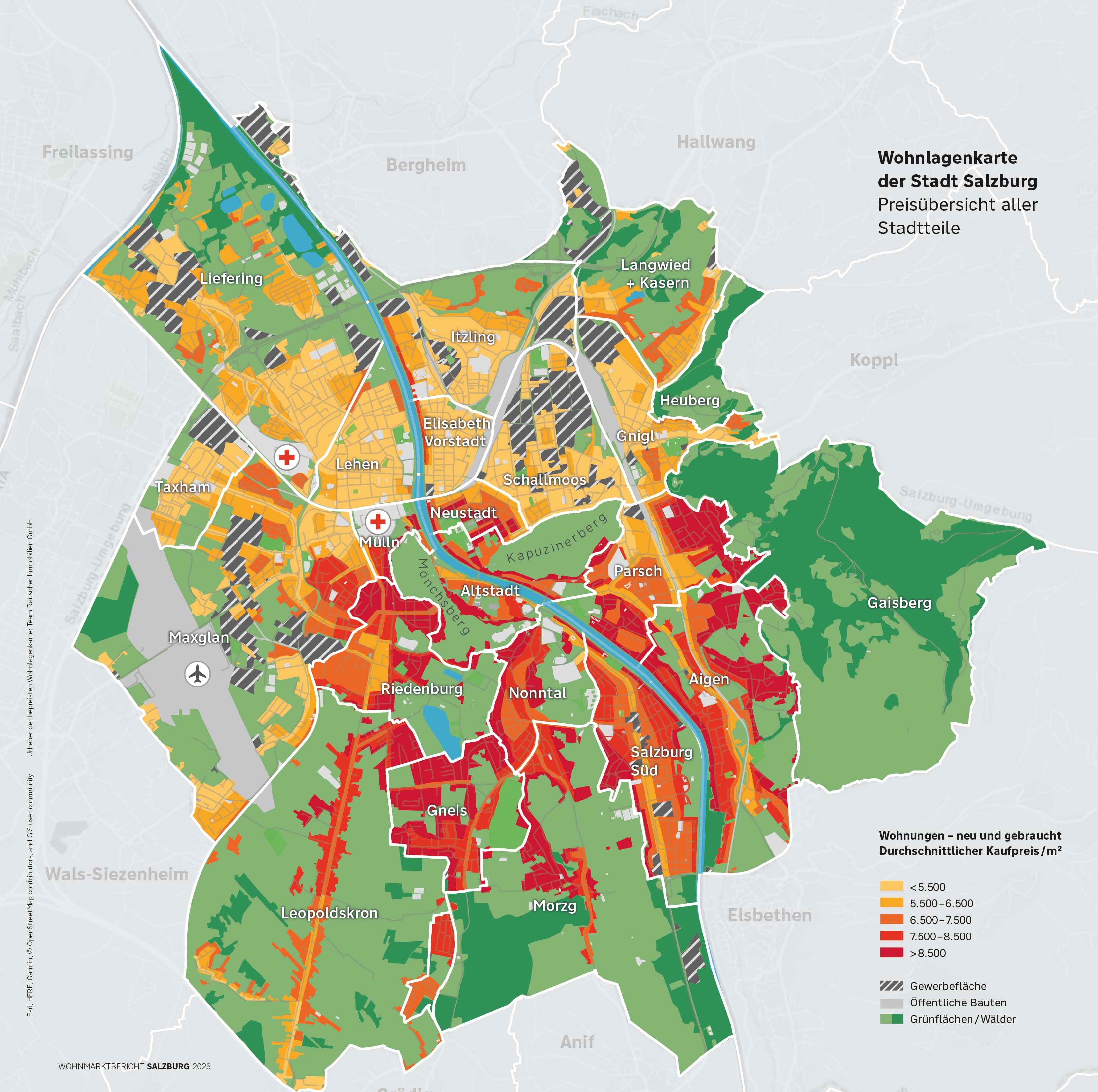 Rauscher: Auch das können Sie besonders gut an unserer Wohnlagenkarte der Stadt Salzburg unterbei erkennen: Besonders beliebt sind Panoramalagen mit Sicht auf die Festung und in die Berge, wie zum Beispiel in Aigen und Parsch, wo man in prestigeträchtiger Nachbarschaft und im Naherholungsgebiet Gaisberg hohe Privatsphäre genießt. Auch Morzg, Gneis oder Leopoldskron sind sehr begehrt, weil sich hier herrliche Ruhelagen am weitläufigen Grünland bzw. in Weihernähe finden. Die Stadtteile Nonntal und Riedenburg profitieren dafür von ihrer Altstadtnähe und der fußläufigen Anbindung zum Festspielbezirk.