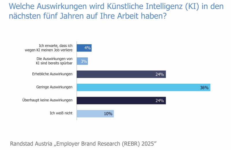 Zur Frage, welche Auswirkungen KI in den nächsten fünf Jahren haben wird, offenbart die neue Studie des internationalen Personaldienstleisters folgende Einschätzungen der Arbeitnehmer:innen: Während sechs von zehn Befragten (60%) demnach nur "geringe" oder "überhaupt keine" Auswirkungen sehen, geht rund ein Viertel (24%) von einem "erheblichen" Einfluss auf ihre Arbeit aus. Jede:r 25. Beschäftigte (4%) erwartet sogar, wegen KI den Job zu verlieren. "Auch wenn die Mehrheit der Befragten keine gravierenden Auswirkungen durch KI befürchtet, ist es aus Sicht von Arbeitgebern wichtig, Sorgen ernst zu nehmen. Etwaige Vorbehalte gegenüber dieser Technologie sollten durch offene Kommunikation mit den Mitarbeitenden und interne Schulungen gelöst werden, um keine Unsicherheit in der Belegschaft zu erzeugen", sagt Bjørn Toonen, Managing Director von Randstad Österreich.
