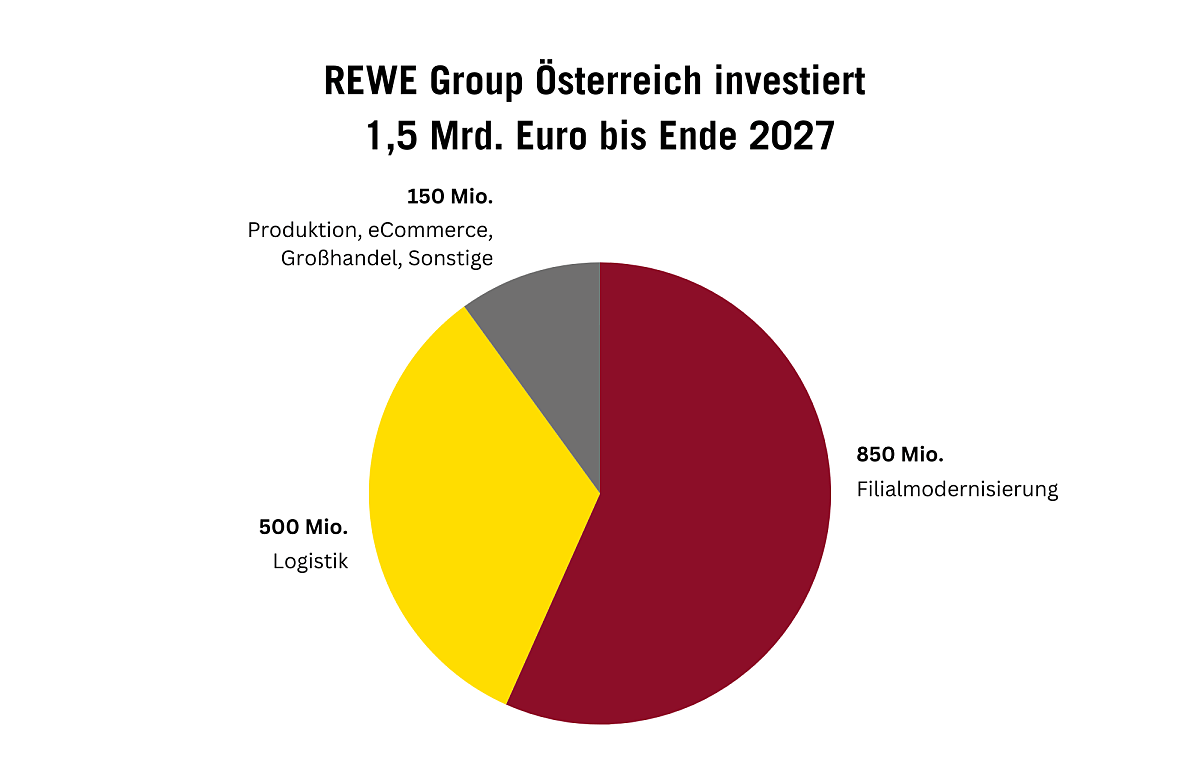 Über 400 Millionen Euro wurden im vergangenen Jahr investiert, vor allem in die Modernisierung des Filialnetzes. Bis 2027 plant die Unternehmensgruppe nun die größte Investitionsoffensive ihrer Geschichte: Insgesamt 1,5 Milliarden Euro sollen in den Wirtschaftsstandort Österreich fließen – davon 600 Millionen Euro in die Logistikstruktur in Wiener Neudorf. Auch bei der Filialanzahl ist einiges in Bewegung. Bei Billa werden heuer 22 Märkte neu- und 50 umgebaut. Bei Bipa gibt es zehn Neubauten und 31 Umbauten, bei Penny 7 Neubauten und 58 Umbauten. Insgesamt werden heuer damit 39 Supermärkte neu gebaut und 139 umgebaut.