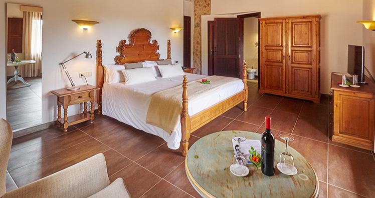 Das verschwiegene Hotel bei Binibona befindet sich direkt auf einem Berg mit jahrhundertealten Olivenbäumen. Es herrscht eine himmlische Ruhe, die höchstens durch das Blöken eines grasenden Schafes unterbrochen wird. Am Tag fasziniert ein fast unbeschreiblicher Blick über die Insel, nachts glitzern die Lichter der benachbarten Orte im Tal. Die romantische Stunde schlägt auf der mit Fackeln beleuchtete Terrasse.