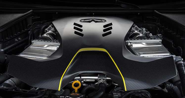 Um Gewicht zu sparen wurde der Infinitiy Project Black S gewaltig optimiert. Frontsplitter, Heckdiffusor, Kotflügel und Seitenschweller sind komplett aus Karbon. Zusätzliche Airblades in den Schwellern verbessern die Aerodynamik und eine neue, leistungsfähige Titan-Abgasanlage reduziert das Gewicht genauso wie superleichte 21-Zoll-Räder. Optisch wirkt das Super-Hybrid-Car dank einem markanten Heckspoiler, großen Lufteinlässen und viel Chrom so richtig sportlich-aggressiv.