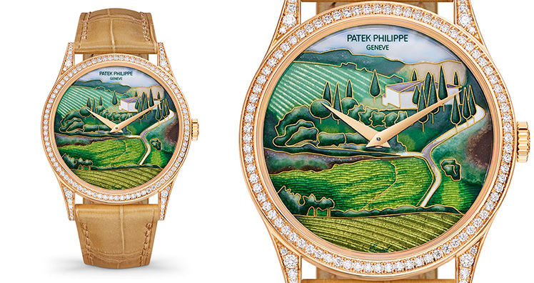 Toskanische Landschaft“ - bei diesem Modell spielen Guillochierung, Cloisonné-Email und Miniaturmalerei zusammen © Patek Philippe