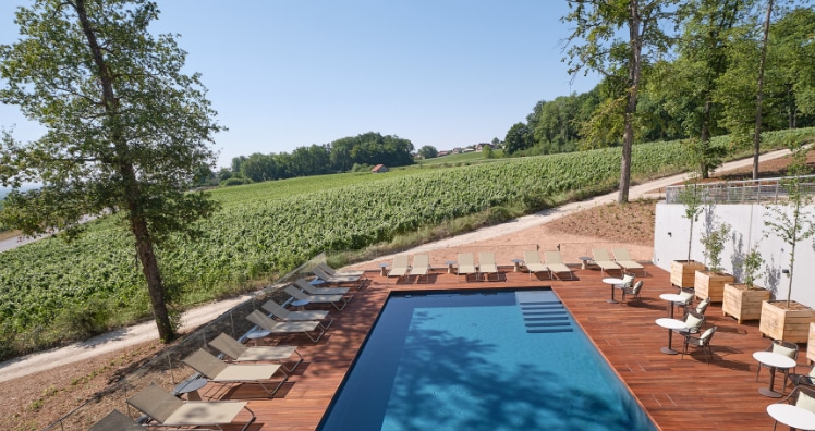 Entworfen wurde das Hotel vom Pariser Architekturbüro Jouin-Manku mit der Vision, die Natur ins Hotel zu holen. Inspiriert von der Umgebung, dominieren natürliche Materialien sowie die Farben Grün und Ocker. Holz und Beton verleihen der modernen Architektur Eleganz und dennoch Gemütlichkeit. Dieses Konzept findet sich auch im Look and Feel der Zimmer wieder. Warme Farbtöne und natürliche Materialen sorgen für wohlige Atmosphäre und vermitteln das Gefühl, inmitten von Wald und Weingärten zu schlafen.