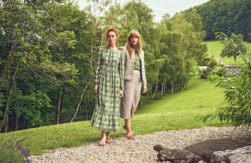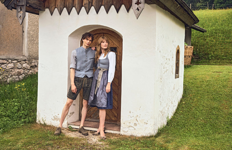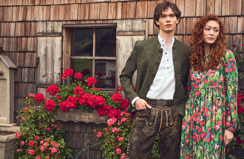 Im März schließt die große Kapsel "Monochrome" an, eine Farbwelt aus Marshmallow, Stein, Taupe und Lorbeer. Die Printmotive und Schattendrucke nehmen diese Töne gekonnt auf und lassen so einen leisen Dialog aus Uni und Muster entstehen. Tier-Motiv-Prints im Pop-Up-Stil lockern das Trachtenthema mit einem Augenzwinkern auf und machen die alpine Inspiration noch alltagstauglicher. Maxikleider mit Volants, wadenlange Röcke mit feinen Biesen und für den Mann Westen und Sakkos mit kleinem Stehkragen, mal tonig, mal im Kontrast abgesetzt, wie es für die Tracht so typisch ist.
