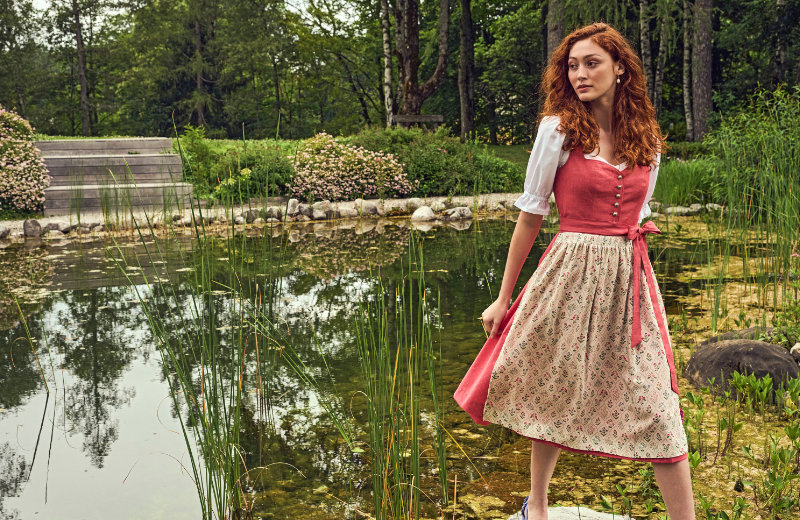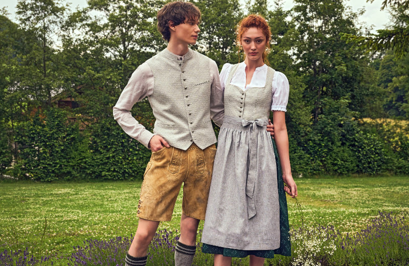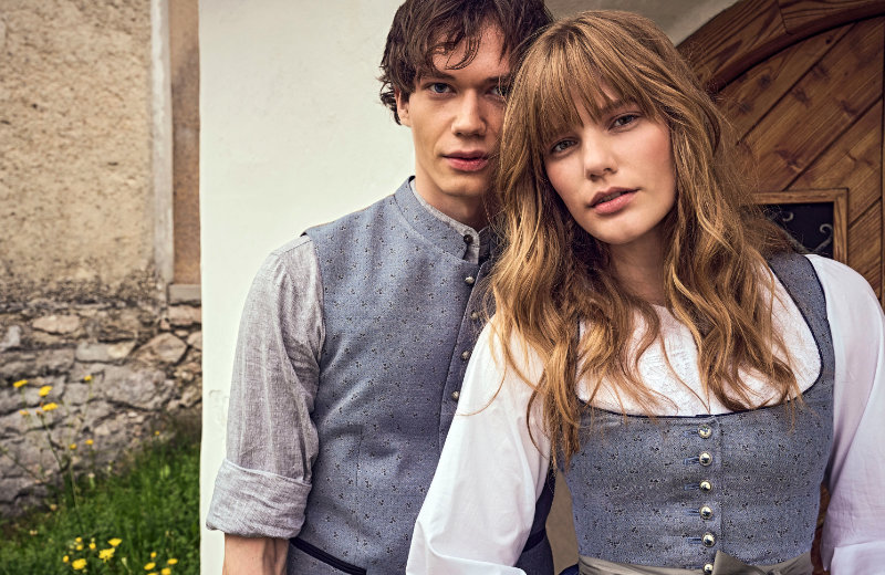Ein bewusstes Farbspiel in unterschiedlichen Abstufungen, das mit seinen Gegensätzen Spannung erzeugt. Florale Prints, sowohl klassisch als auch modern, setzen Akzente. Für Dirndl und passende Herrenwesten kommt ein fein gemusterter Stretch-Jacquard zum Einsatz, auch Leinen in elastischen Qualitäten ist in Modellen enthalten.