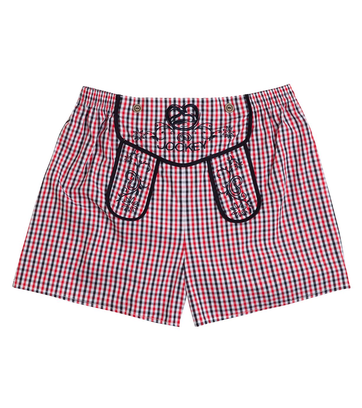 7, Da legst di nieda. Inspiriert von traditionell-bayerischen Motiven zeigt sich die Original JOCKEY® Wiesn Shorts im klassischen Karomuster in den Farbstellungen Navy und A-Red. Die schmale Silhouette greift den Schnitt einer kurzen Lederhose auf und sorgt für einen optimalen Sitz. Besonderer Blickfang sind der aufgesetzte Latz mit typischen Verzierungen in Herzform, die Knöpfe in Hirschhornoptik sowie die liebevollem Stickereien für perfektes Wiesn-Feeling.