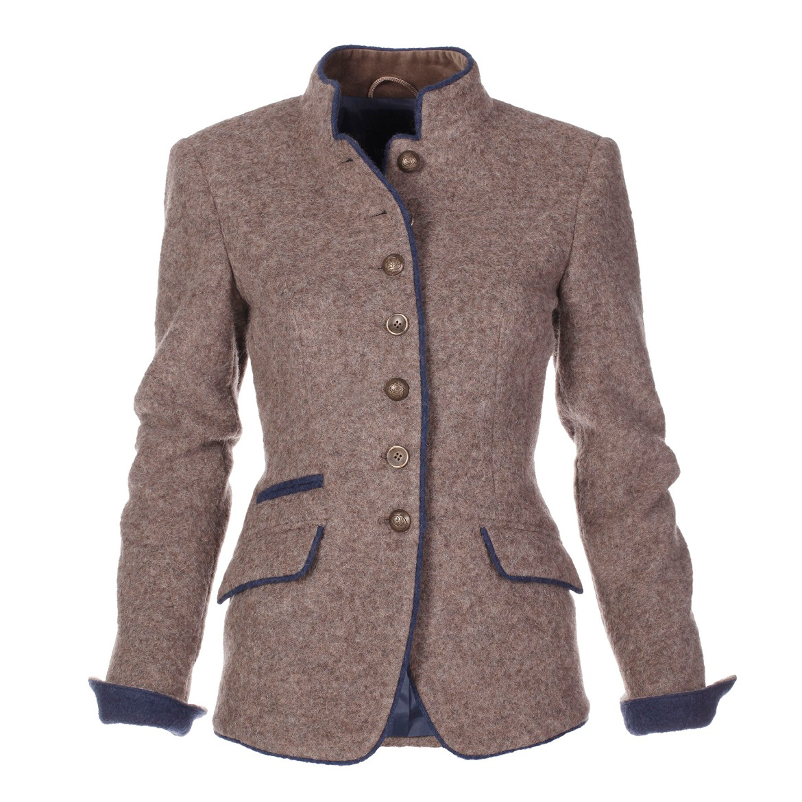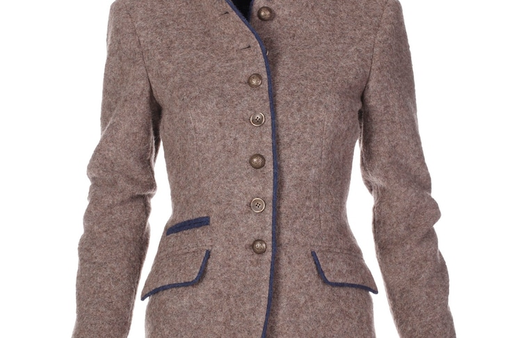 2, Überdrüber: Den Walkblazer in trendigem Cyclam kann man dank der leichten Taillierung wunderbar über dem Dirndl tragen. Verspielte Knöpfe lockern den klassischen Look dezent auf