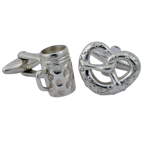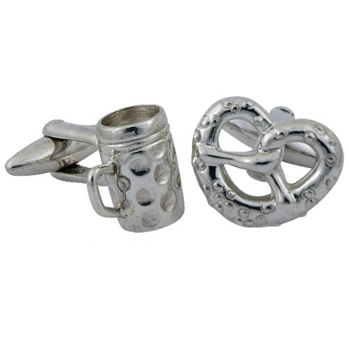 11, Maß und Brezel: Die Manschettenknöpfe sind der ideale Begleiter für das Oktoberfest. Sie sind handgefertigt und aus 925er Silber, die Oberfläche beider Manschettenknöpfe ist poliert, die Innenseite des Bierkruges ist aufgerauht.
