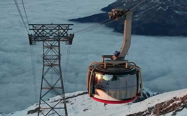 TITLIS Rotair ist die einzige drehbare Gondel der Welt. Die Passagiere steigen an der Mittelstation, die sich in dem Dorf Engelberg befindet, in die Gondel und fahren 5 Minuten lang bis auf 3.025 Meter. Die Kabine macht eine volle Umdrehung bis zum Gipfel und bietet einen großartigen Blick aus jeder Position.