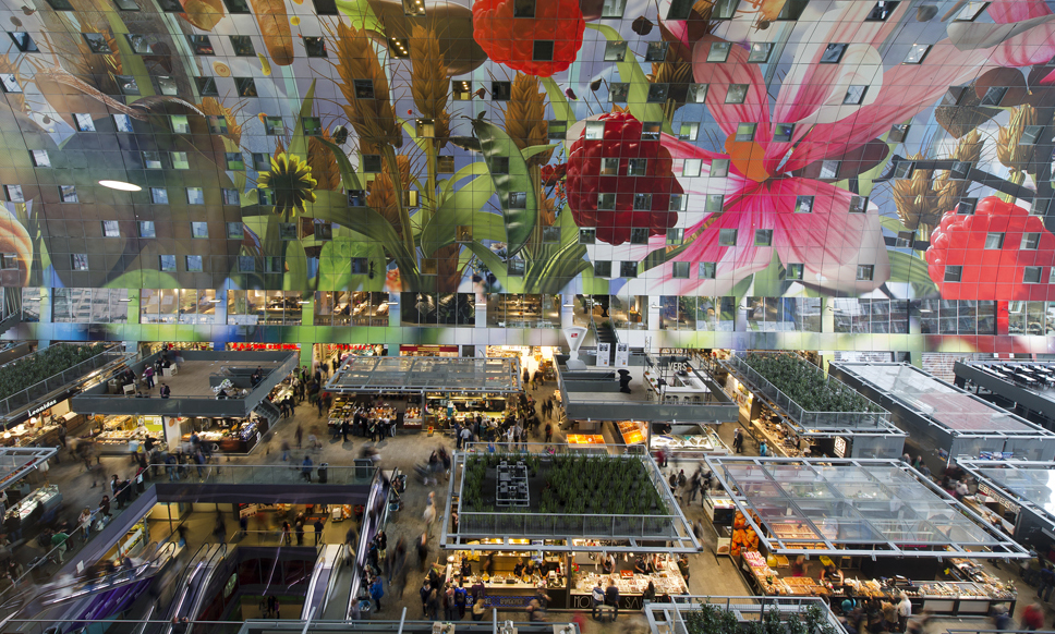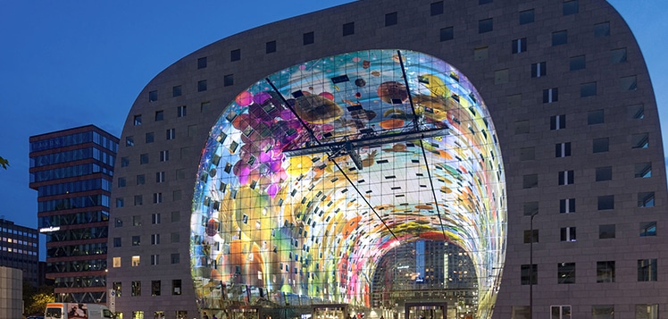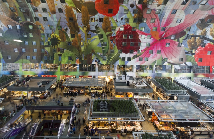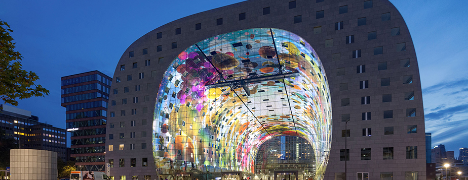 "De waanzin" denken sich nicht nur Touristen, sondern auch Einheimische, die zum ersten Mal die Rotterdamer Markthalle besuchen. 120 Meter ist sie lang, 70 Meter breit, der Scheitelpunkt des Gewölbes liegt in 40 Metern Höhe.Im Korpus der Hufeisen-Form sind hunderte von Wohnungen untergebracht. In der Halle bieten gut 100 internationale Stände ihre Ware feil. Hier bekommt man nicht nur echten Holland Gouda oder Tulpen, sondern auch Bio-Waren aus aller Welt.