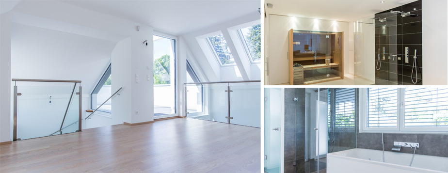 Die Raumausstattung entspricht dem höchsten Niveau, sowohl beim luxuriösen Bad, als auch beim eigenen Saunabereich. – Nach einem angenehmen Saunagang können Sie sich in Ihrem eigenen Lichthof weiter ungestört entspannen.