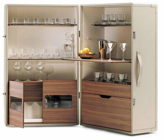 Eine Hausbar ist immer ein Zeichen von Stil und Atmosphäre. In der Originalversion von Jean-Marie Massaud ist "Isidoro von Poltrona Frau" ein eleganter Container auf Rollen, der sich wie ein Buch durch externe Griffe öffnen lässt und sich durch einen Klick wieder verschließt. Ein wertvolles Objekt gefertigt aus edlen Materialien und bis ins letzte Detail geplant. Die durchdachte Gestaltung des Innenbereiches beinhaltet Glas und Flaschenhalter mit Metallringen und ein klappbares Brett, das als praktische Oberfläche für die Zubereitung der Getränke dient (9).