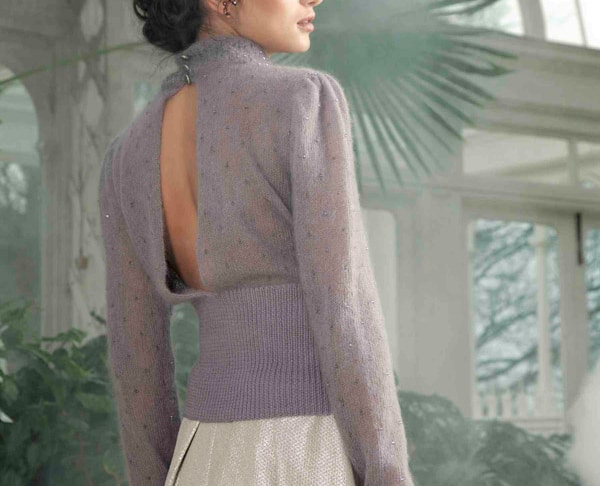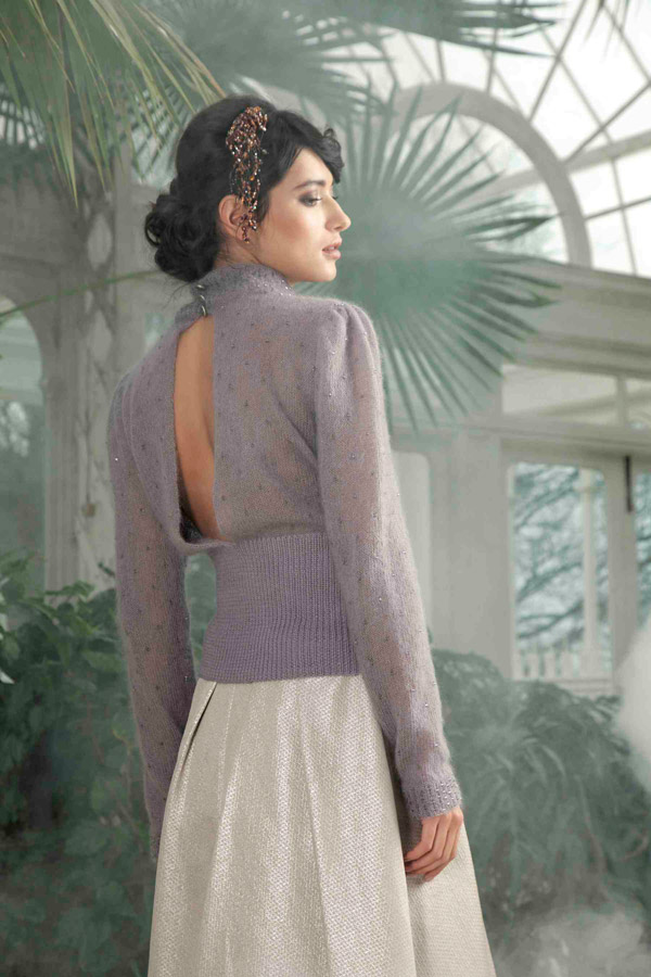 Echte Fashionistas stricken sich ihre Kleidung selbst, denn Stricken ist sinnlich und kreativ zugleich. Der Pullover mit tiefem Ausschnitt im Rücken ist ein echter Hingucker und besteht aus luxuriöser Rowan-Wolle und edlen Swarovski-Kristallen, die nach dem Stricken draufgenäht werden. Die Garne und Swarovski-Kristalle für den Pullover gibt es beim Woll-Online-Shop(12). Ein schicker Begleiter beim Winterspaziergang sind auch die Chloé Drew (14), die Warm Me Cashmerebeanie (16) und wärmende Boots von Mou (15).