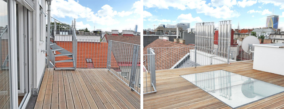 Flachdach gehen, wo Sie einen 360-Grad-Rundumblick über Wien erwartet. Diese Terrasse eignet sich auch zur Montage von