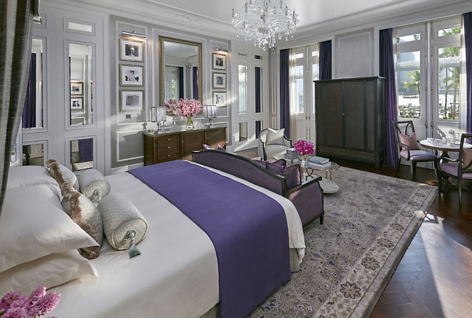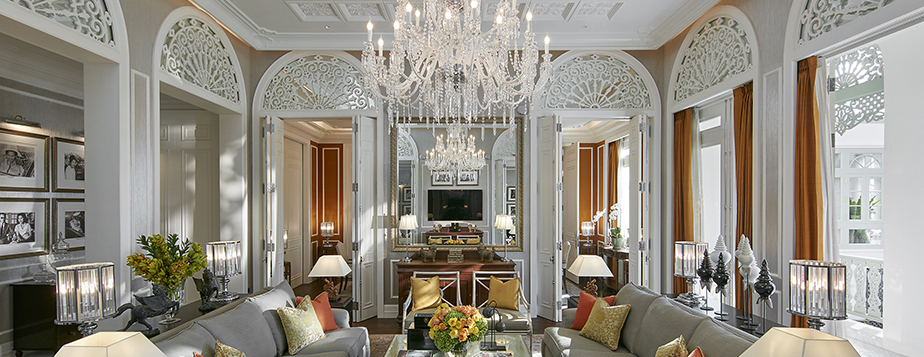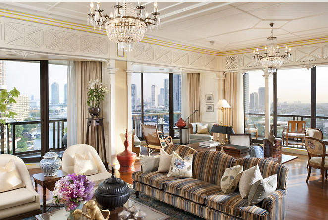 Die neue Suite mit eigenem Aufzug erstreckt sich über die gesamte erste Etage. Sie besteht aus der 315 Quadratmeter großen Royal Suite mit einem Schlafzimmer, der angrenzenden Ambassador Suite (165 Quadratmeter) mit zwei Schlafzimmern sowie drei weiteren Gästezimmern. Außerdem verfügt die Suite über zahlreiche repräsentative Räume, wie zwei großzügige Wohnzimmer, Bibliothek, Küche, Speisezimmer für bis zu zwölf Gäste und einem lichtdurchfluteten Wintergarten im klassischen Viktorianischen Stil. An den ursprünglichen Bau von 1876 angelehnt, wurden die Balkone wieder geöffnet, damit die Gäste den traumhaften Blick über die Gärten und den Fluss genießen können. Für das noble und elegante Design der Suite zeichnet das renommierte thailändische Designbüro P49 DEESIGN verantwortlich. Traditionelle thailändische Holzschnitzereien und aufwändiger Stuck spiegeln die legendäre Geschichte des Hotels wider. Auch feinste thailändische Seide kam zum Einsatz: in den Wohnräumen in Goldtönen, im Master Schlafzimmer in einem kräftigen Violett.