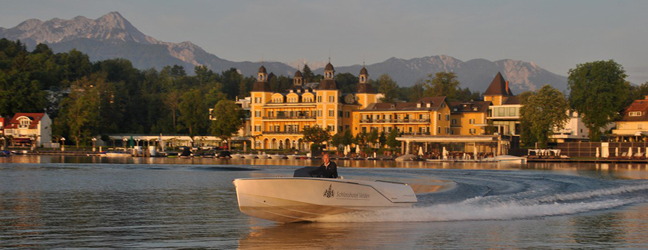 Den schönsten Blick auf das schimmernde Blau hat man vom weltberühmten Schloss am Wörthersee, das aus der gleichnamigen Fernsehserie mit Schlagersänger Roy Black bekannt ist. Heute ist das Schloss ein Luxushotel, das aber immer noch zu den Markenzeichen des Wörthersees zählt. Schon beim Eintreten in die historischen Gemäuer des Fünf-Sterne Falkensteiner Schlosshotel Velden erwartet den Gast zeitloser Luxus und schlichte Eleganz auf höchstem Niveau, gemischt mit frischen Akzenten in Rosa, Apfelgrün und Türkis. Der Concierge wartet am knallroten Empfangsbereich und erfüllt alle Wünsche. Auch das Gepäck findet wie von selbst in die luxuriösen und modern ausgestatteten Zimmer und Suiten, die mit viel Liebe zum Detail eingerichtet wurden. Hier kann man im Badezimmer fernsehen, kuscheln im Kingsize-Bett und die wunderschöne Aussicht auf den Wörthersee oder den bezaubernden Rosengarten des Anwesens genießen. Danach taucht man ein in ein einzigartiges SPAradies für Körper und Geist: das preisgekrönte 3.600 m² große Acquapura SPA.