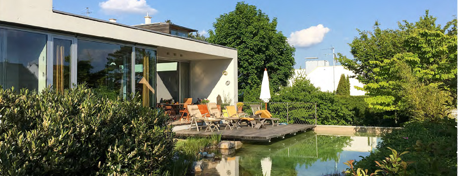 Das Konzept für diese einzigartige lichtdurchflutete Sichtbetonvilla im grünen Hietzing beruht auf einer dynamischen Form, welche um einen kleinen Innenhof gebaut ist und in einem Turm-Zimmer mündet. Sämtliche Bereiche – ob Wohnen, Essen oder Schlafen – sind in fließenden Raumübergängen angeordnet. Akkurat positionierte Sichtbezüge schaffen individuelle Raumerlebnisse, Innen- und Außenräume gleiten förmlich ineinander. Über ein großzügiges Entree erreicht man die Hauptwohnebene. Küche und Esszimmer – durch Glasschiebeelemente voneinander abtrennbar – sind sowohl zum Innenhof als auch zum Garten mit dem naturnah angelegten Schwimmbiotop orientiert. Eine Rampe führt in den knapp ein Meter höher liegenden Rückzugsbereich. Vom Wohnzimmer wie auch dem Kaminzimmer öffnet sich der Blick direkt in den angrenzenden Hörndlwald. Der Innenhof und der tiefer liegende Essbereich geben wiederum den Blick frei in den Garten und den Naturbadeteich.