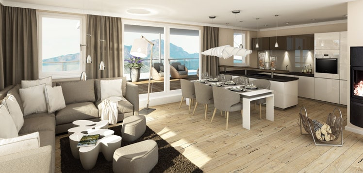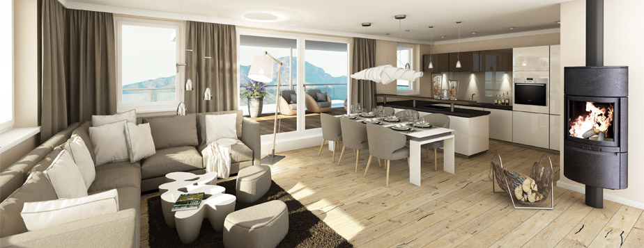 - Die mit über 52 m² luftige Wohnraumküche mit Kaminanschluss für einen wohlig warmen Schwedenofen;