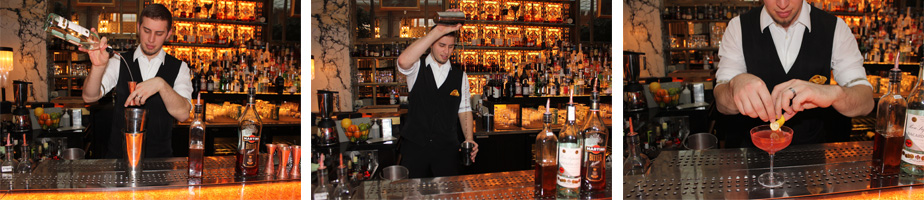 Zubereitung: den Shaker mit Eiswürfel füllen, die Zutaten in einen Becher geben und mit einem Strainer in einen leeren „werfen“, etwa zehn Mal hin und her; in eine vorgekühlte Cocktailschale gießen und mit einer Grapefruitzeste parfümieren; als Deko schnitzen und am Glasrand drapieren.