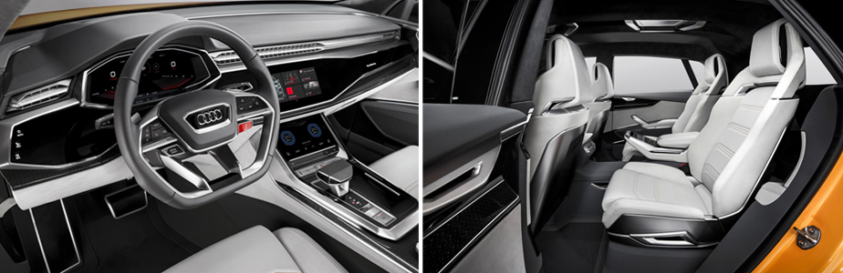 Der Innenraum des Audi Q8 sport concept hält opulent viel Platz für vier Personen und ihr großes Reisegepäck bereit. Der Kofferraum fasst 630 Liter. Weitläufig gespannte Linien verleihen dem Cockpit eine sportliche und zugleich elegante Atmosphäre. Beinahe schwebend über dem Mitteltunnel befindet sich eine Konsole, die den Shift-by-Wire-Hebel integriert. Damit steuert der Fahrer das Achtstufen-tiptronic-Getriebe rein elektronisch. In den vorderen Türen startet der Wrap-around: Dieser große, horizontale Bogen verläuft am unteren Rand der Windschutzscheibe und fasst die Plätze von Fahrer und Beifahrer ein, ohne die Insassen einzuengen. Die Sportsitze sind – wie auch die beiden Einzelsitze im Fond – aus Segmenten zusammengesetzt, die wie separate geometrische Körper wirken, von den ausgeprägten Wangen bis zu den Kopfstützen. (et)