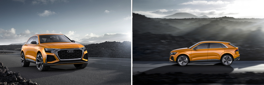 Auf dem Genfer Automobilsalon 2017 stellt Audi ein weiteres Konzeptauto der künftigen Q8-Modellfamilie vor. Die Studie Audi Q8 sport concept demonstriert die Visionen der Audi-Entwickler und Designer für den dynamischen wie effizienten SUV von morgen. Achtzylinder-Performance bei Vierzylinder-Verbrauch, 3.0 TFSI V6-Motor mit Mildhybrid-Technologie und Stop & Go und Einparken elektrisch, zukunftsweisende Antriebstechnologie und betont sportliche Optik.