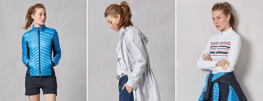In der Damenkollektion liegt die Kernkompetenz auf „Function meets Fashion“ bei Jacken. Insgesamt gibt es sechs verschiedene Outdoorjacken – von der Leichtdaune über Windbreaker und Parka aus federleichtem Nylon bis zum funktionellen Zweieinhalb-Lagen-Jacket, das zu 100 Prozent wasserdicht ist. Viele Jacken kombinieren unterschiedliche Materialien wie Leichtdaune mit Sweat oder Powerstretch mit Jersey. Weiße Kontrastnähte und -Tapes sowie neue Steppungen sind kleine Details, die den Modellen einen besonderen Twist verleihen. Farbverläufe für Daunenjacken sind ein weiteres Highlight. Bei den Hosen dominieren lässige Jogginghosen und Bermuda, teils auch dezent bestickt. Sweats, Polo-Shirts und Tuniken ergänzen die Kollektion. Als Druck wurde ein exklusiver Palmenprint auf Nylon, Sweat und Jersey übersetzt. Key-Look: ein federleichter Parka zu Polo und Joggingpants aus Funktionsmaterial.