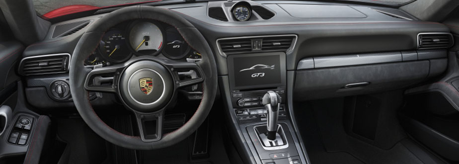 Das Interieur des neuen Hochleistungssportwagens ist auf ein maximales Fahrerlebnis zugeschnitten. Das GT-Sportlenkrad mit einem Durchmesser von 360 Millimetern stammt ursprünglich aus dem 918 Spyder. Fahrer und Beifahrer erleben die Dynamik in Porsche Sportsitzen Plus mit erhöhten Seitenwangen und mechanischer Längsverstellung. Die Lehnen- und Höhenverstellung erfolgen elektrisch.