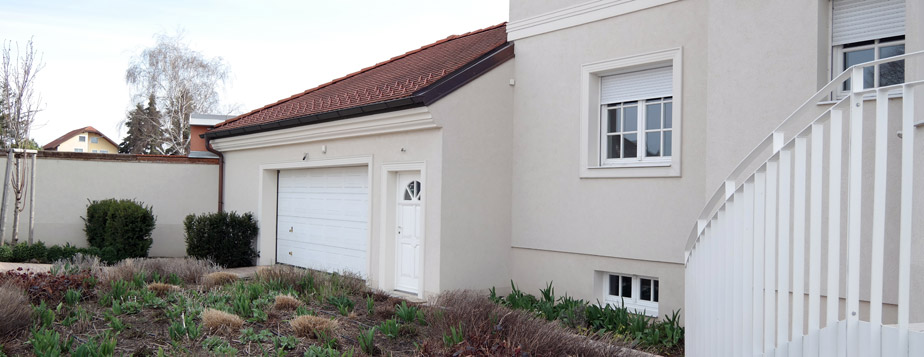 Von der Doppelgarage (ca. 41 m²) aus, haben Sie direktem Zugang in den Garten und die Villa. Die ca. 13 m² Terrasse ist aus dem größten Zimmer im Erdgeschoß begehbar.