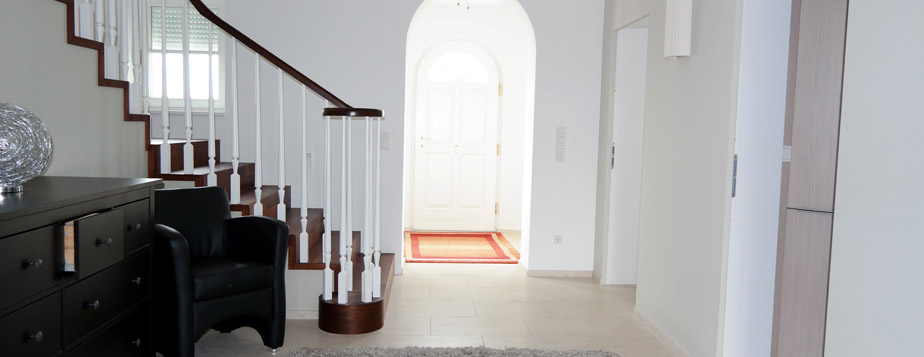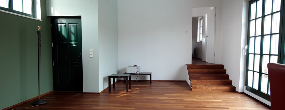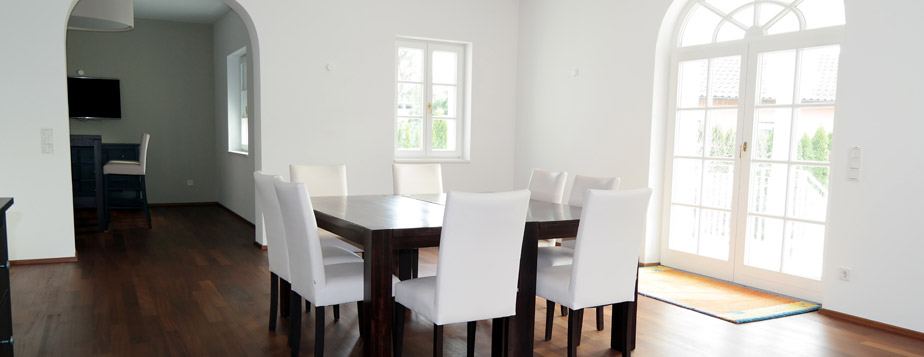 Im Erdgeschoß wurde Parkett, Keramik sowie Stein im Nassbereich als Bodenbelag verwendet.
