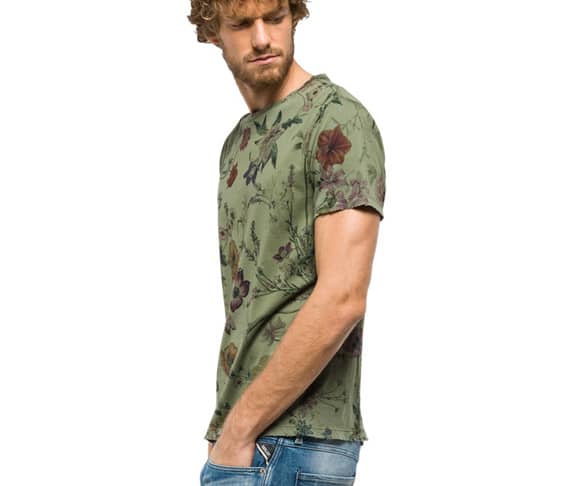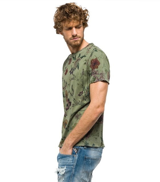 Herren brillieren in einem Polohemd aus reinem Baumwollpikee mit aufgedrucktem Camouflage-Muster und kontrastfarbenem klassischem Kragen mit zwei Knöpfen Bunte, auf einer Seite und auf den Ärmeln applizierte Patches, und dem T-Shirt aus reinem Baumwolljersey mit vollflächig aufgedrucktem, buntem Blumenmuster und Rundhalsausschnitt. Kleine Risse anden Saumkanten verleihen dem T-Shirt einen dezenten Used-Look.