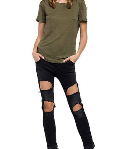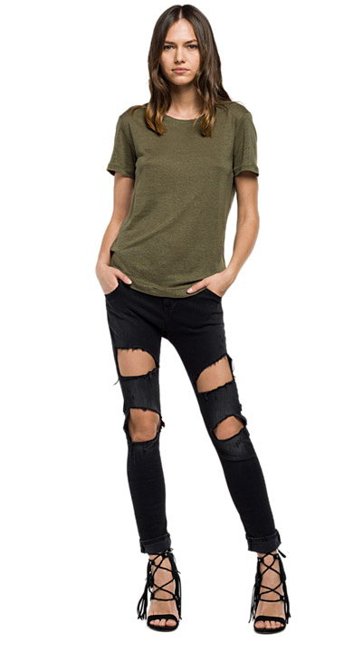 Dazu ein einfarbiges Damen-T-Shirt aus reinem Leinenjersey mit Rundausschnitt. Kleine vollflächig angebrachte Risse verleihen dem T-Shirt einen trendigen Used-Look. (External Cloth: 100 Prozent Flachs)