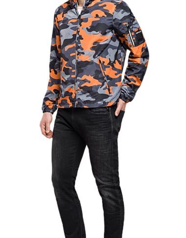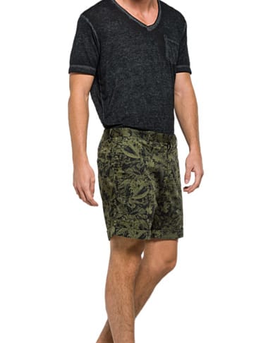 Herren-Bermudashorts aus Baumwollstretch-Satin bestechen mit vollflächig aufgedruckten kontrastfarbenen Pflanzenmotiven. Zwei Leistentaschen auf der Vorderseite und zwei Gesäßtaschen, Verschluss mit Reißverschluss und klassischem Knopf. Dazu die Herrenjacke mit Camouflage-Aufdruck. Hoher Kragen, elastische Ärmelbündchen, zwei Leistentaschen mit Reißverschluss auf der Vorderseite und kleine Ärmeltasche. Verschluss mit Reißverschluss.