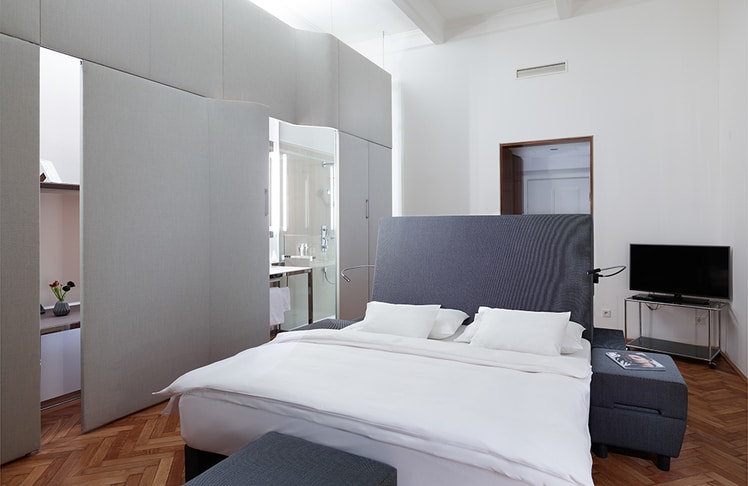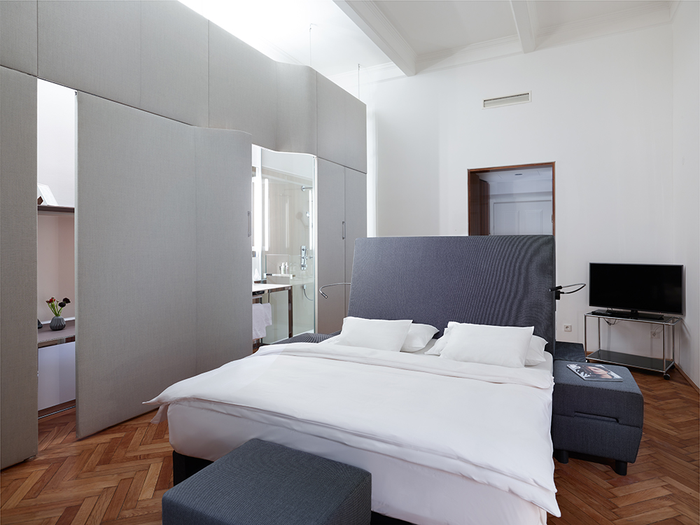 Zeitlose Eleganz versprüht das Projekt des österreichischen Möbeldesigners und Architekten Adolf Krischanitz. Bei der Gestaltung mit Leuchten, Sofas und Sessel greift er auf österreichische Manufakturen wie Wittmann, Braun, Lockenhaus und Zumtobel zurück und verleiht dem Raum so eine ganz persönliche Note. Seit 1979 arbeitet er als freischaffender Architekt mit Ateliers in Wien und Zürich. "Die Zusammenarbeit mit dem Altstadt Vienna begeistert mich, weil es ein innovatives Hotelkonzept ist. Der besondere Aspekt, dass hier Wohnungen zu Hotelzimmern umgebaut werden, gibt dem ganzen Projekt etwas Besonderes. Jeder Raum schlägt durch die verschiedenen Architekten und Designer eine bestimmte gestalterische Richtung ein. Das finde ich sehr reizvoll. Zudem weiß ich, nachdem ich in sehr vielen Hotels gewohnt habe und immer noch wohne, was die Anforderungen für ein Hotelzimmer sind", so Krischanitz.