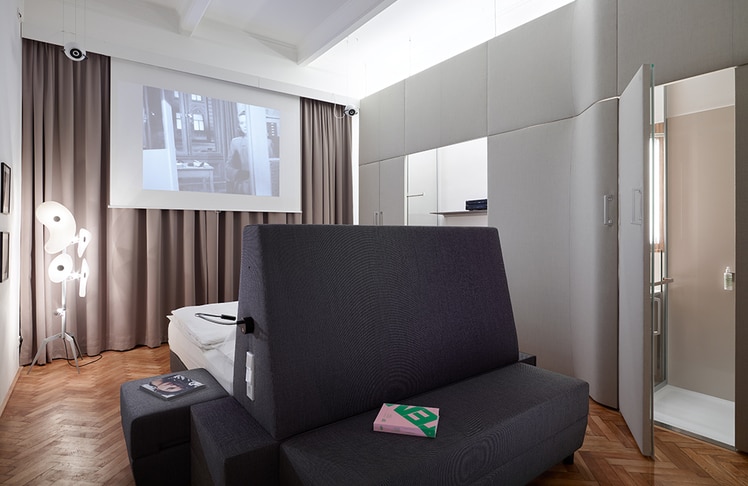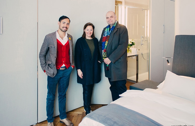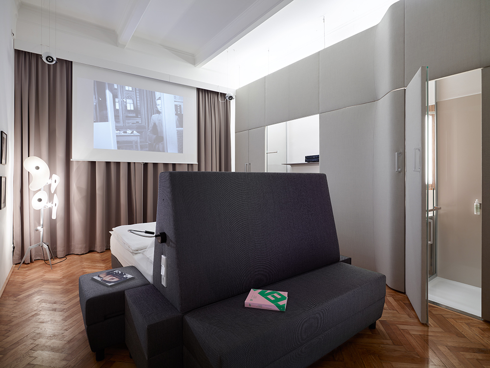 Für Lilli Hollein, die Direktorin der Vienna Design Week, ist es das erste Interior-Design-Projekt. Gemeinsam mit ihrem Ehemann, dem Designer Markus Eiblmayr, interpretiert sie das Wiener Lebensgefühl auf moderne Weise. Seit 20 Jahren ist die studierte Designerin als Kuratorin, Autorin und Journalistin in den Bereichen Architektur und Design tätig. Architekt Roland Nemetz greift auf einen mehr als 40-jährigen Erfahrungsschatz zurück. In dem von ihm gestalteten Zimmer, das über dem OFF Theater liegt, sorgen schwere Vorhänge, Leuchten und ausgewählte Vintage-Möbelunikate von Roland Rainer für eine Atmosphäre wie in einem Theatersaal. Nemetz hat ein Büro in Baden, das im Zuge von großen Projekten bis zu 25 Mitarbeiter beschäftigt. Das Zimmer des österreichischen Architekten Gregor Eichinger zeichnet sich vor allem durch klare Formen und Farben aus. Gregor Eichinger wurde 1956 in Wels geboren, studierte Architektur an der TU Wien und arbeitete in Architekturbüros, Werbeagenturen und Filmproduktionen. Seit 2005 betreibt er eichinger offices.