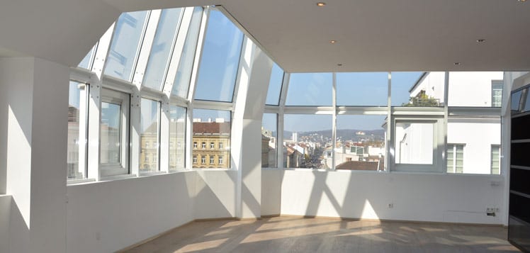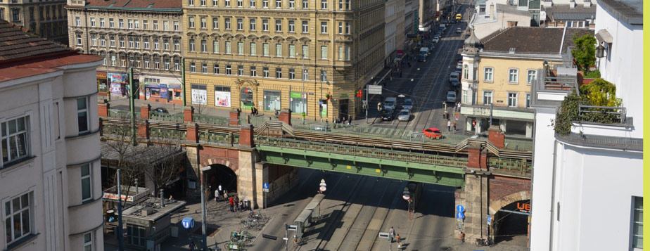 Sie genießen eine Panoramasicht über die Dächer von Wien samt Blick auf Schloss Wilhelminenberg während unter Ihnen das Leben und Treiben der Stadt pulsiert.