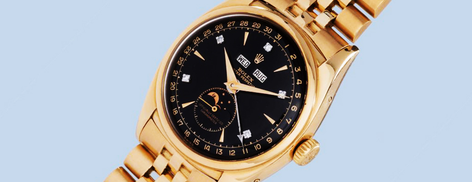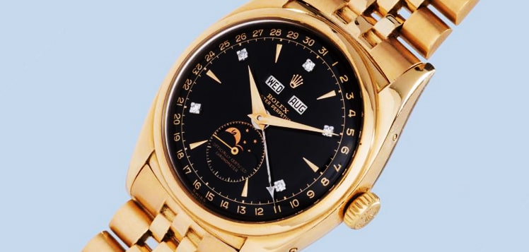 Laut Phillips ist die Rolex 6062 „Bao Dai“ das komplizierteste Modell mit einem Oyster-Gehäuse und gleichzeitig eines von nur drei bekannten Exemplaren mit schwarzem Zifferblatt und Diamantindexen. Als einziges Modell trägt sie jedoch die Diamanten zur Kennzeichnung der geraden Stundenzahlen. Eine Ausnahme stellt die Sechs dar: Hier findet die Mondphasenanzeige mit kleiner Sekunde Platz. Ihr gegenüber, unter der Zwölf, erscheinen der Wochentag und Monat im Fenster, das Datum zeigt der zentrale Zeiger mit Pfeilspitze. In dem Oyster-Gehäuse aus 18-karätigem Gold, mit 36 Millimeter Durchmesser, arbeitet ein Rolex 655 Automatikwerk. (et)