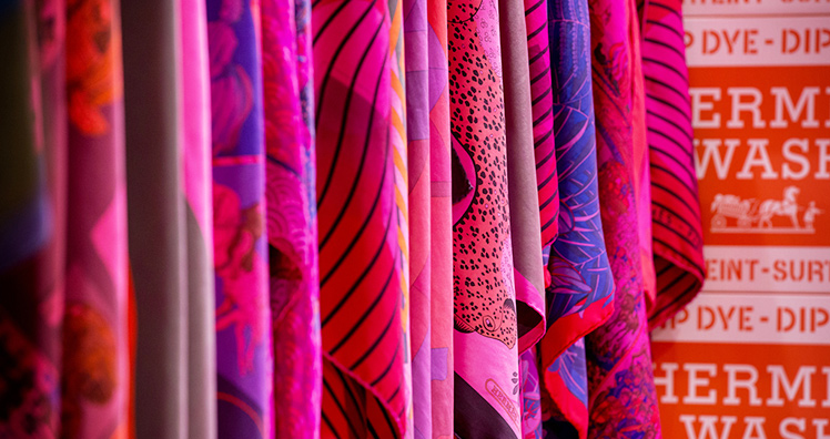 Diese Idee hat etwas für sich. Die kreative Färbetechnik „HermèsMatic“ verwandelt alte Carrés in neue. Seidentücher, die schon lange in einer irgendeiner Lade verschwunden waren, erhalten eine frische, attraktive Farbe und passen damit wieder zur aktuellen Garderobe.