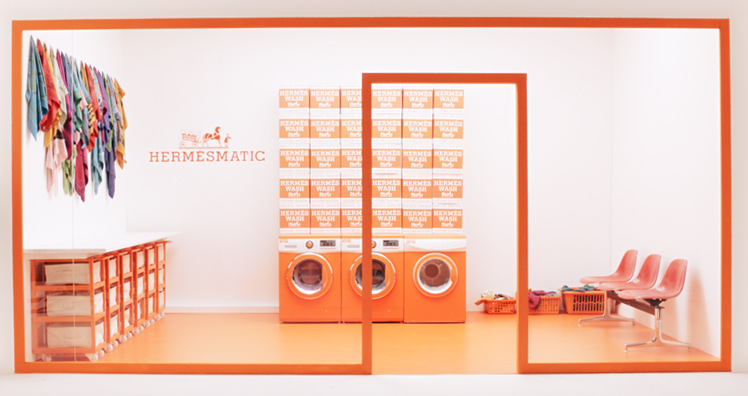 Vom 8. bis 18. November 2017 eröffnet HermèsMatic in der Wiener Innenstadt einen Pop-Up Store in Form eines Waschsalons. Orangefarbene Waschmaschinen, ein Sortiment an bunten Farben und schon wird aus einem alten Carré ein neues, frisches Unikat. Wer will, bringt sein eigenes Hermès-Seidentuch mit, um es zu färben, kann aber auch vor Ort eine Vielfalt an neuen Seidenaccessoires, wie Mini-Fliegen, Twillies bzw. neue Carrés entdecken.