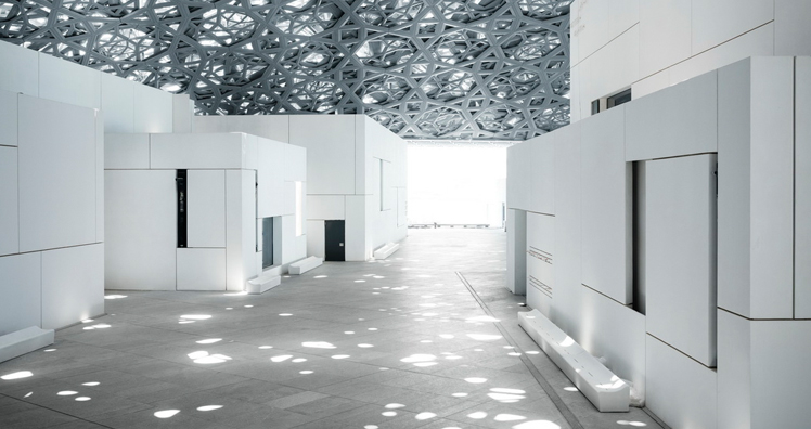 Knapp 100.000 Quadratmeter Fläche umfasst der imposante Monumentalau des französischen Architekten Jean Nouvel, insgesamt 8.600 Quadratmeter sind Ausstellungsfläche, darunter 6.400 für die Dauerausstellung und 2.000 für die Wechselausstellungen. Das atemberaubende Herzstück des Louvre Abu Dhabi bildet ein 180 Meter breites Kuppeldach aus fast 8.000 Metallsternen, die in einem komplexen geometrischen Muster angeordnet sind. Die unglaubliche Kuppelkonstruktion ist das Werk eines österreichischen Unternehmens - der Firma Waagner-Biro. Das einfallende Sonnenlicht durch das silberne Dach erzeugt einen „Lichtregen“, der an die Palmblätter in den arabischen Oasen erinnern soll.