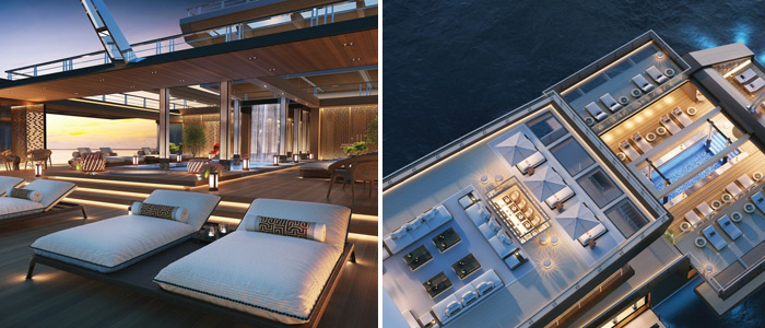 Der Außenbereich mit einem einzigartigen Spa-Deck samt Pool und Regendusche befindet sich auf Höhe des Meeresspiegels. Über eine Rundtreppe führt der Weg auf das 900 Quadratmeter große Panorama-Deck. Von dort erschließt sich den Gästen ein unglaublicher Blick auf das offene Meer. Eine fantastische Aussicht hat man allerdings rundum auf der Yacht, von den Liegen am Pool, vom Sonnendeck, aber auch durch die überdimensionalen Fenstern der Gemeinschaftsräume.