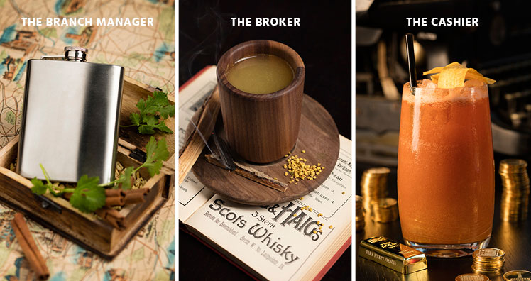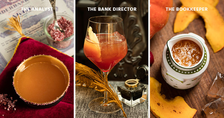 Auf der in Form einer Zeitung „The Bank Time“ gestalteten Karte, die Cocktails mit ihren Zutaten sind als Diagramm abgebildet, steht an erster Stelle der „Analyst“. Ein leichter, erfrischender Tequila- Cocktail, gewürzt mit einem Sirup aus Szechuan und Curmin in Kombination mit einem Tannenwipferlsirup. „The Secretary“, ein fruchtig, leicht erfrischender Cocktail mit einem Zimtespuma-Topping, welches dem Ganzen einen extra Kick gibt und den Cocktail wunderbar vollmundig macht, gilt als sicherer Tipp für die Vorweihnachtszeit. „The Broker“ dagegen ist ein kräftiger Cocktail im Old Fashioned Stil, der viele Zutaten aus der Natur miteinander verbindet.