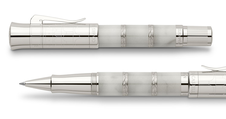 Für den Pen of the Year 2018 „Imperium Romanum” in Weiß wählte der Hersteller eine besondere Varietät des Statuario-Marmors aus Carrara. Jedes einzelne Exemplar wurde in der Edelsteinmanufaktur Stephan von Hand gefertigt. Zwischen die Marmorsegmente des Schafts sind platinierte Ringe mit Lorbeerkränzen gearbeitet und ein weiteres außergewöhnliches Detail der Edition ist die aufwendig gearbeitete Kappe mit der Gravur des berühmten Kolosseums und einem Caesar-Denar mit dem Konterfei des Imperators aus dem Jahr 44 v. Chr. Der platinierte Füllfederhalter mit 18-Karat-Bicolor-Goldfeder ist auf 400 Exemplare limitiert. Vom Tintenroller werden 120 Exemplare aufgelegt.