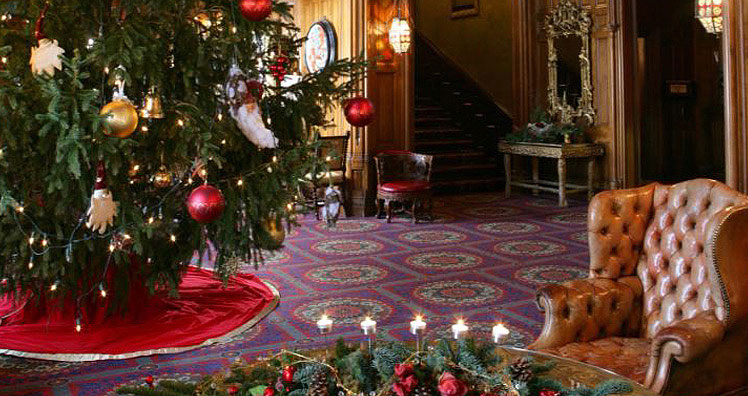 Ein hoher, reichlich geschmückter Weihnachtsbaum ragt im offenen Eingangsbereich des „Ashford Castle“ in Country Mayo, Irland, bis hinauf in den ersten Stock. Im ehemaligen Wohnsitz der irischen Brauerei-Familie Guiness herrscht vor allem eine gemütliche Atmosphäre, allein wegen des wunderschönen offenen Kamins im alten Schloss.