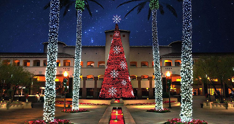 Ganz anders dagegen der bunte Lichterglanz im „Fairmont Scottsdale Princess“ in Arizona, USA. Zahlreiche, in allen Farben glitzernde Weihnachtsbäume, Palmen und Figuren schmücken den Eingangsbereich, die festliche Dekoration geht allerdings weit über die Hotel-Lobby hinaus. Den Gästen steht sogar eine Eislaufbahn mitten in der Wüste zur Verfügung und verschiedene Lichtershows verwandeln das Hotelgebäude zum Beispiel in ein Lebkuchenhaus.