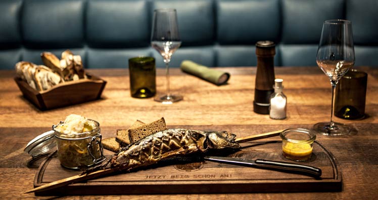 Auf der Speisekarte geben die Betreiber keine konkrete Richtung vor, sie wollen sich auch nicht auf etwas Spezielles konzentrieren. "Wir orientieren uns vegetarisch, deftig, aus der Pfanne, schon mit einem Schwerpunkt Fisch, allein wegen des Hafenthemas, aber auch nicht zu übertrieben. Unser ,Signatur-Dish‘ ist ein Steckerlfisch. Dieser traditionell an einem Stäbchen gegrillte Fisch vermittelt etwas Bodenständiges, es handelt sich dabei keineswegs um ein Haubengericht, er wird auch nicht elegant serviert. Somit weiß man, hier läuft es nicht nach Etikette.“ Zur ganztägigen Karte, von 11 bis 23 Uhr, kommt ein wöchentlich wechselndes Mittagsmenü mit Suppe oder Salat als Vorspeise, zwei verschiedenen Hauptspeisen und zwei gleichbleibenden Speisen, einen Fischburger zwecks Hafenthema und Eiernockerl als klassische Wiener Küche. Dazu gibt es einen großen Suppentopf, mit wöchentlich wechselndem Inhalt. Die Preise sind sehr moderat, auch das gehört zum bodenständigen Hafenkonzept. Einen Wiener Klassiker, das Wiener Schnitzel sucht man vorerst vergeblich auf der Karte. „Nicht aus Überheblichkeit,“ betont Werner Helnwein, „sondern weil wir uns zu Beginn anders präsentieren wollen. Irgendwann wird es sicher ins Programm aufgenommen.“ Dafür erweist sich das Mehlspeisenangebot als durchaus wienerisch. "Unsere Patissière Bernadette Harbich verfügt tatsächlich über sagenhafte Verführungskünste.“